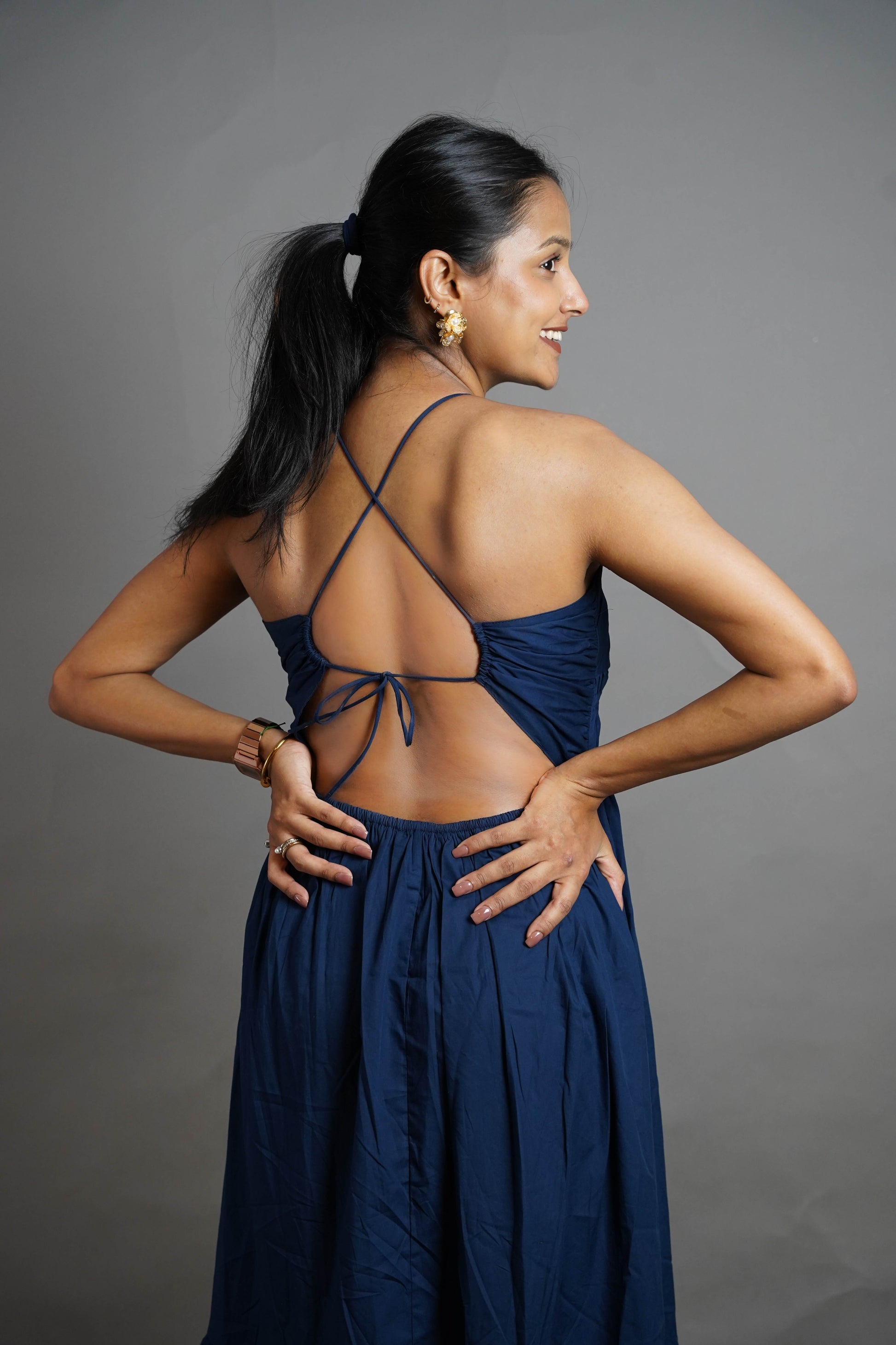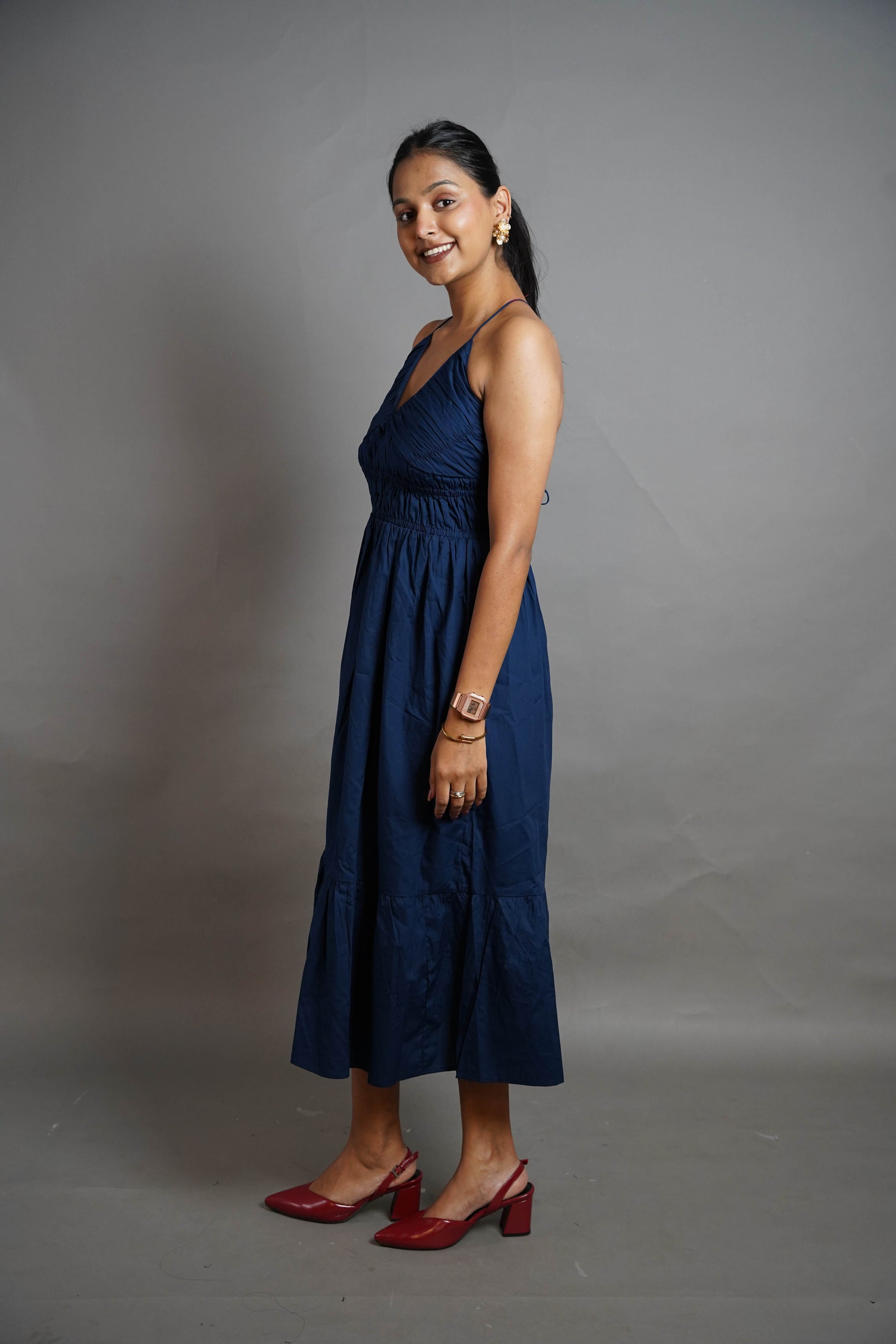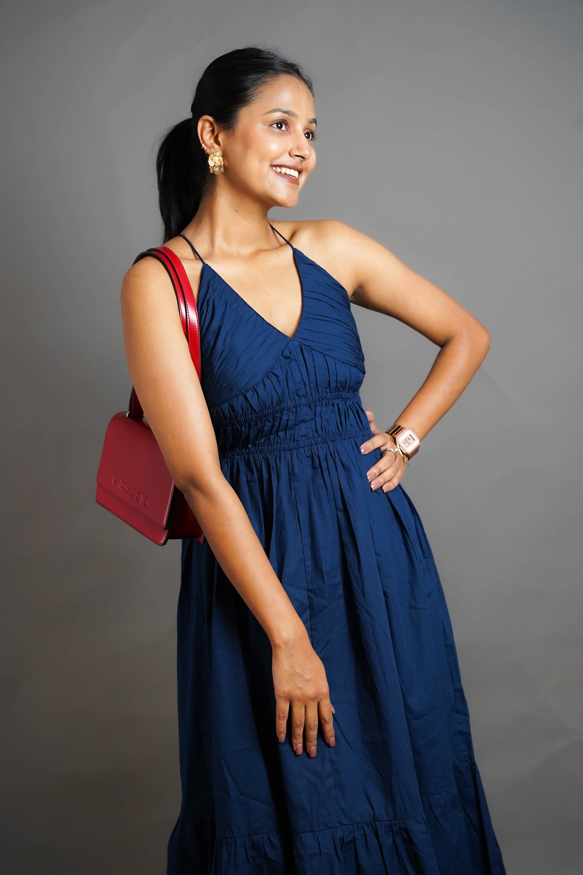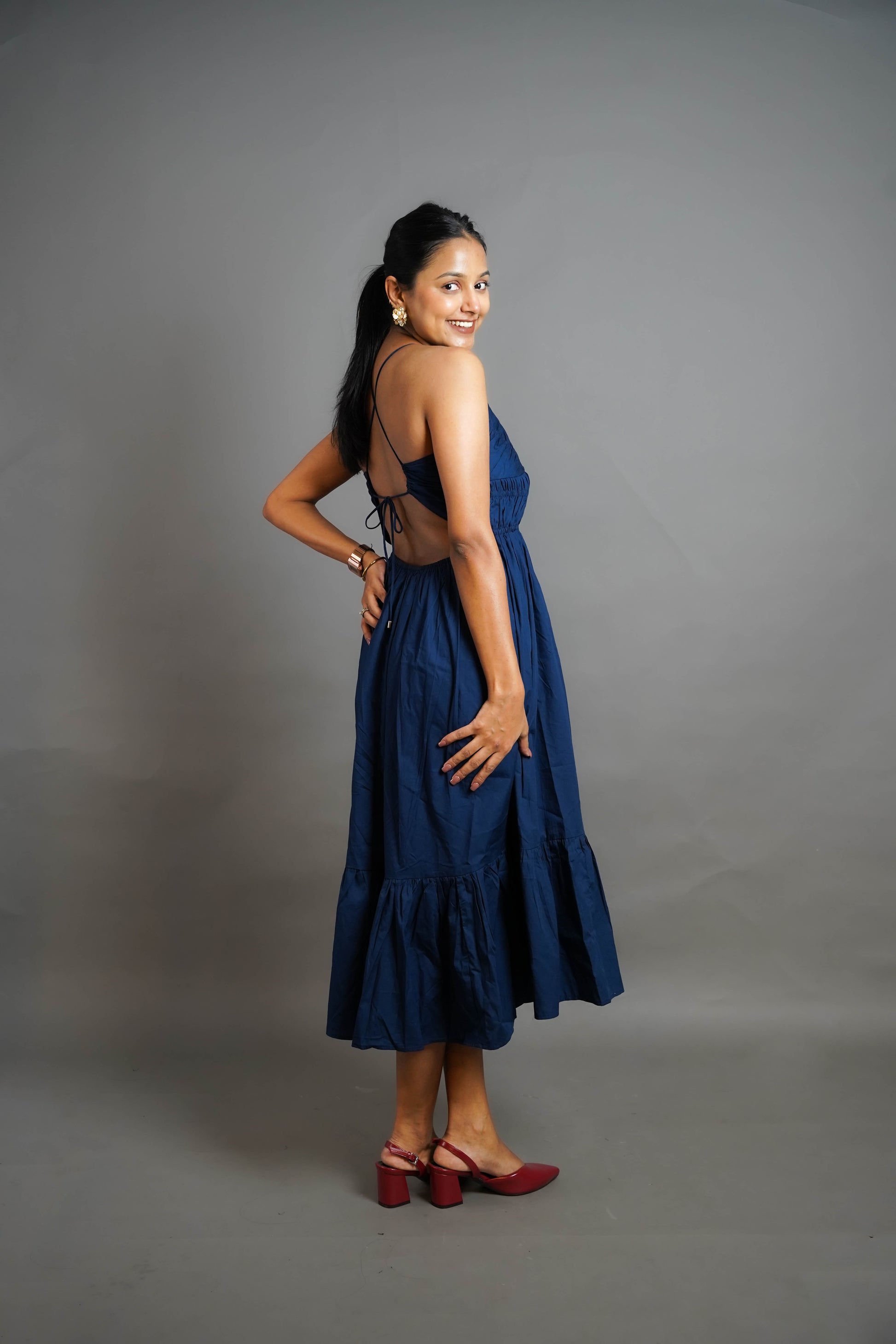 Dress a royal blue halter-backless cotton midi that blends comfort and elegance. With its ruched bodice, open tie-back, and flowy tiered skirt, it’s perfect for brunches, beach strolls, or evening dinners.