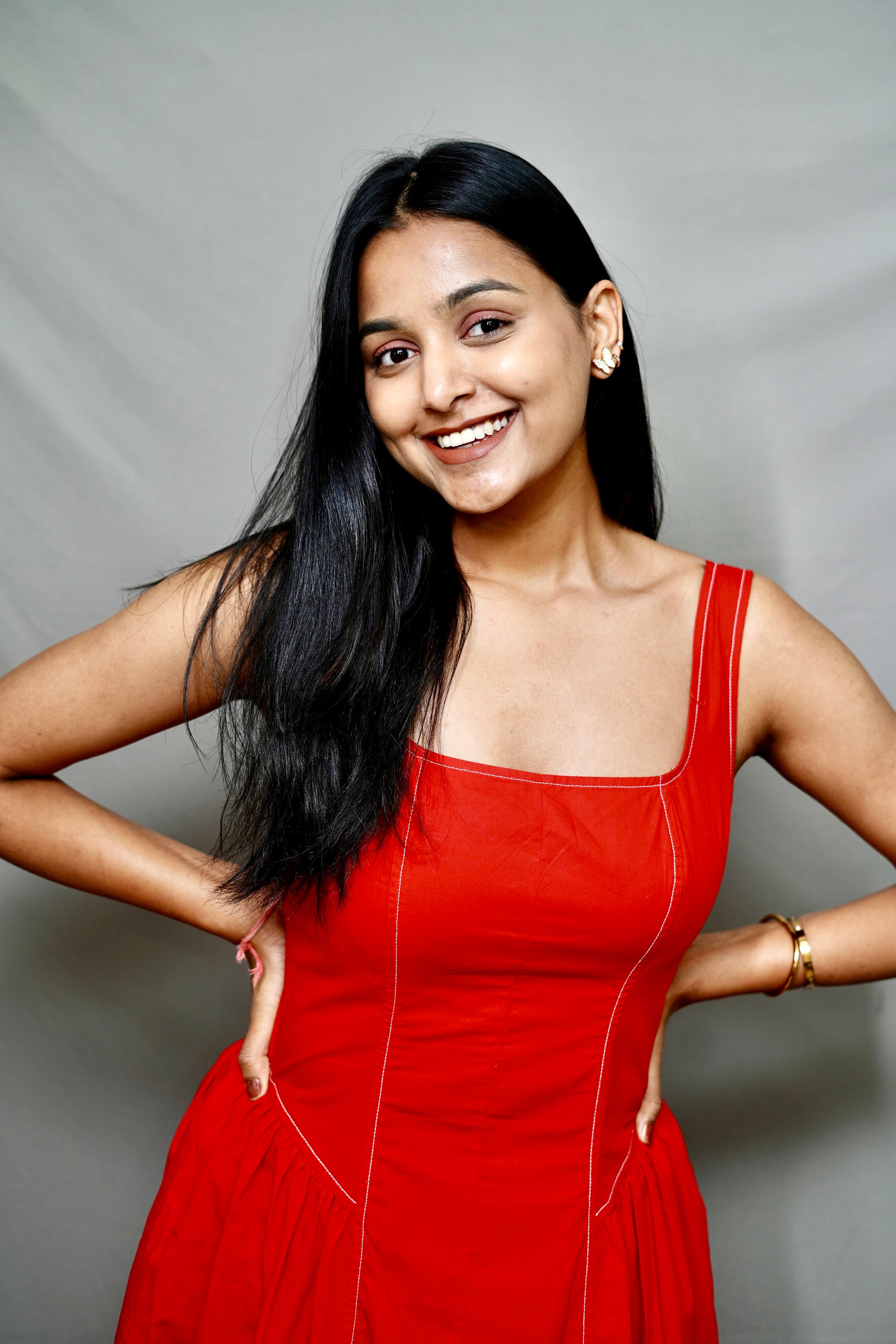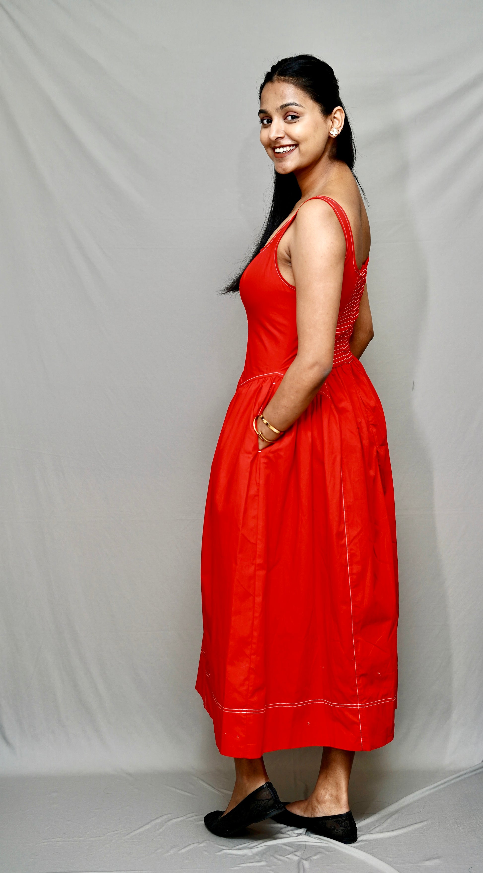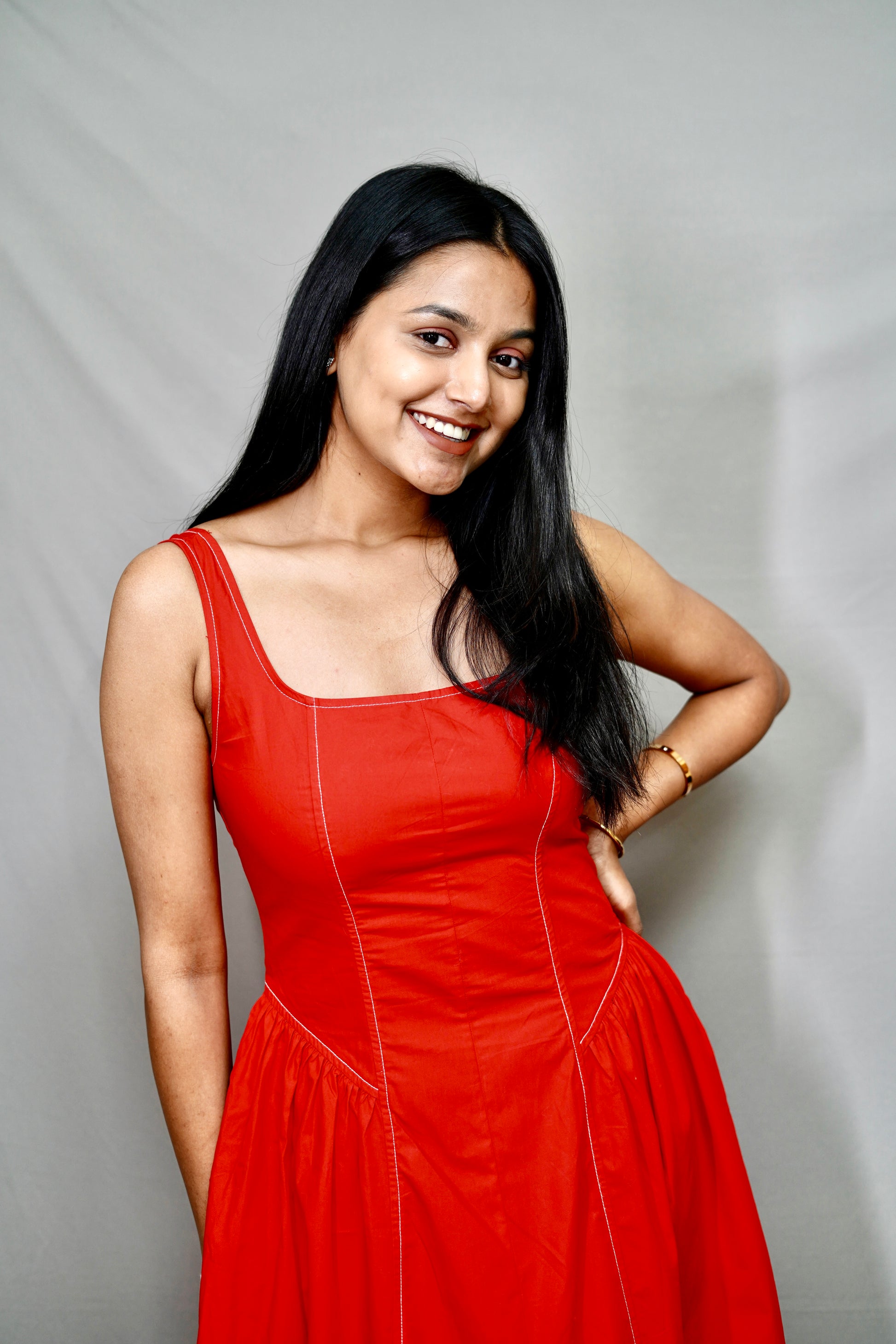Our Christmas Eve showstopper. This vivid red midi features a flattering structured silhouette and a twirl-worthy skirt, ensuring you look effortlessly chic for every Christmas memory—from opening gifts to dinner.